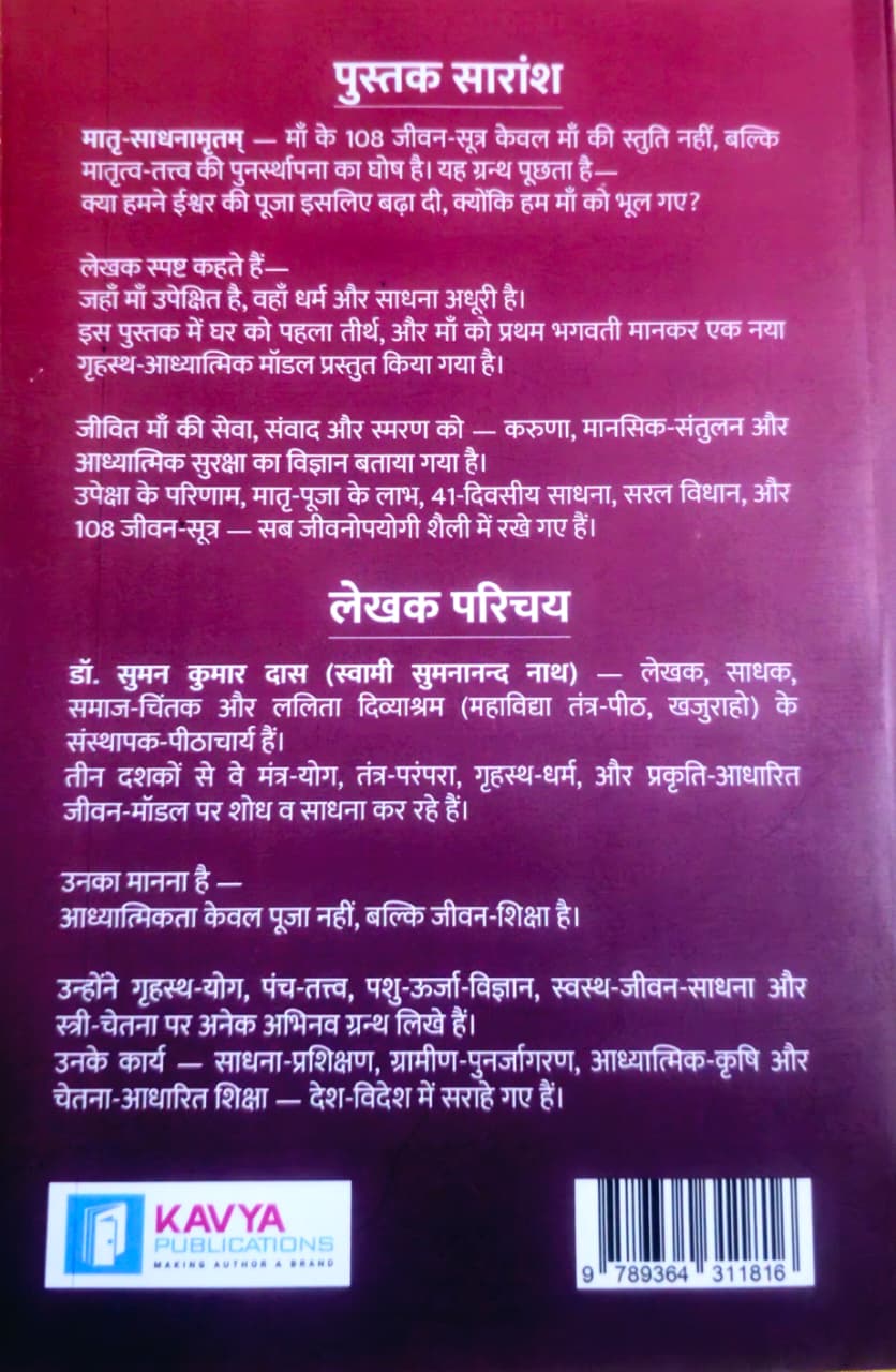 मातु-साधनामृतम् — माँ के 108 जीवन-सूत्र केवल माँ की स्तुति नहीं, बल्कि मातृत्व-तत्त्व की पुनर्स्थापना का घोष है। यह ग्रंथ पूछता है— क्या हमने ईश्वर की पूजा इसलिए बढ़ा दी, क्योंकि हम माँ को भूल गए? लेखक स्पष्ट कहते हैं— जहाँ माँ उपेक्षित है, वहाँ धर्म और साधना अधूरी है। इस पुस्तक में घर को पहला तीर्थ, और माँ को प्रथम भगवती मानकर एक नया गृहस्थ-आध्यात्मिक मॉडल प्रस्तुत किया गया है। जीवित माँ की सेवा, संवाद और स्मरण को — करुणा, मानसिक-संतुलन और आध्यात्मिक सुरक्षा का विज्ञान बताया गया है। उपेक्षा के परिणाम, मातृ-पूजा के लाभ, 41-दिवसीय साधना, सरल विधान, और 108 जीवन-सूत्र — सब जीवनोपयोगी शैली में रखे गए हैं।