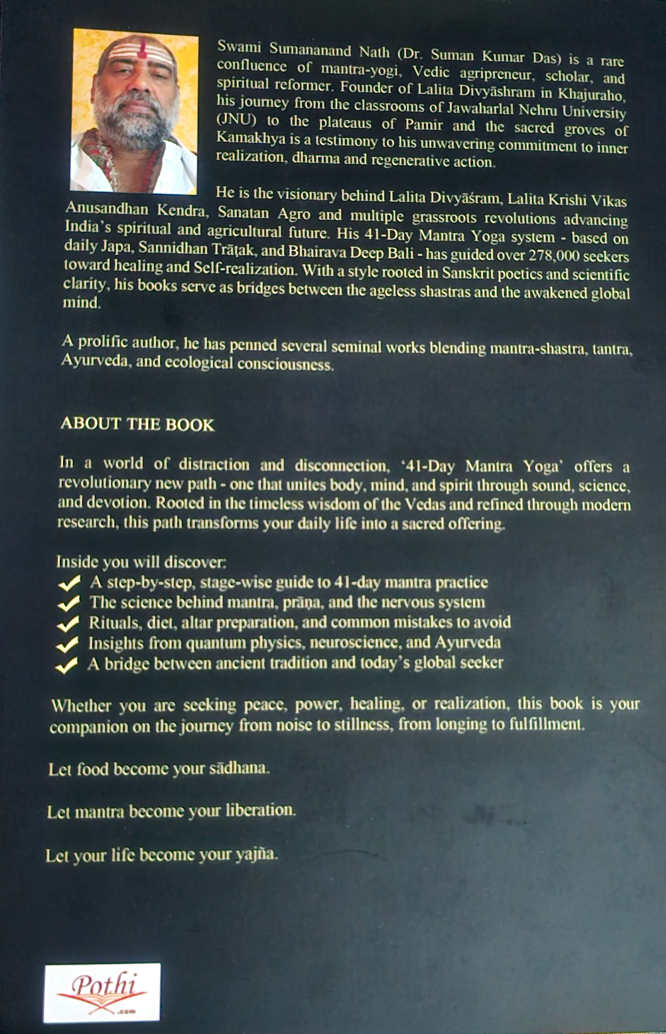 41-Day Mantra Yoga By Swami Sumanananda Nath From Sankalpa to Siddhi – a scientific, spiritual, and practical journey of transformation. This book presents a unique 41-day path of Mantra Yoga Sadhana, blending ancient Vedic wisdom with modern scientific insights. Rooted in the living tradition of Lalita Divyāshram, Khajuraho, the system harmonizes three powerful practices: Mantra Japa – rhythmic repetition of sacred sound to awaken inner energy. Trataka (Flame Gazing) – deep concentration that steadies the wandering mind and activates higher awareness. Bhairava Deep Bali – an evening ritual of surrender and empowerment, performed under the Urdhva Peepal for protection and grace. Structured in daily steps across 41 days, the guide takes the seeker through psychological, spiritual, and practical milestones. Each day builds discipline, healing, and focus, culminating in the 42nd-day Mantra Purascharana Yajna—a powerful offering that transforms Sankalpa (intention) into Siddhi (fulfilment).